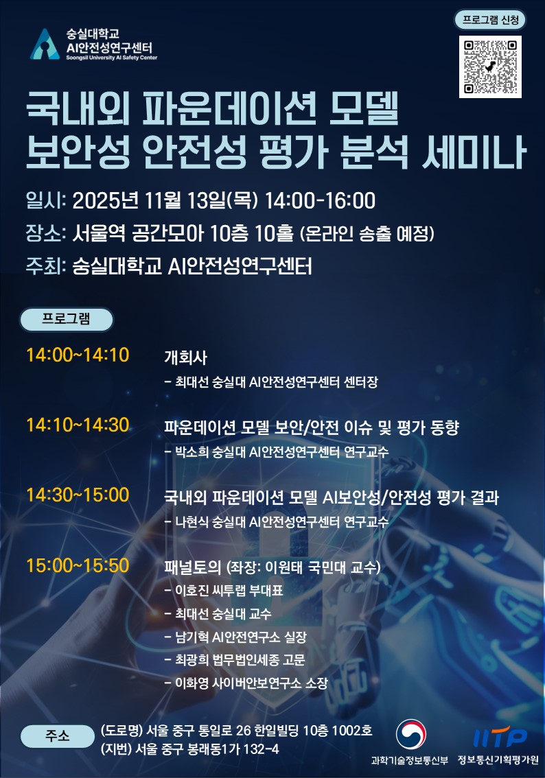 - 57종 공격 평가 결과 공개…SKT·LG·카카오 등 국내 모델, 글로벌 GPT·Llama 대비 취약- AI 레드티밍 플레이그라운드 필요성 제기, 위협정보공유·지속적 레드티밍·방어기술 테스트·인력양성 숭실대학교(총장 이윤재) AI안전성연구센터(센터장 최대선, 정보보호학과 교수)는 국내외 주요 파운데이션 모델(LLM) 20종을 비교한 결과, 국내 모델의 보안성과 안전성이 해외 대비 약 82% 수준에 그친다고 13일 밝혔다.이번 분석은 ‘국내외 파운데이션 모델 보안·안전성 평가 세미나’에서 공개됐으며, 과기정통부·정보통신기획평가원의 ‘정보보호핵심원천기술개발사업’ 연구과제의 일환으로 수행됐다.연구팀은 1.2B부터 660B 규모까지 다양한 모델을 대상으로 프롬프트 인젝션, Jailbreak, 유해 콘텐츠 생성 유도 등 총 57종의 최신 공격 기법을 적용했다. 평가 모델에는 SKT A.X, LG EXAONE, 카카오 Kanana, 업스테이지 Solar, 엔씨소프트 VARCO 등 국내 모델과 OpenAI GPT 시리즈, DeepSeek R1, Meta Llama, Anthropic Claude, Alibaba Qwen 등 해외 주요 모델이 포함됐다. 또한 모델을 직접 설치해 실행하는 ‘단독형’과 기업이 제공하는 보안 기능이 포함된 ‘서비스 통합형’을 구분해 평가한 점이 특징이다.서비스 통합형 평가에서는 Anthropic Claude Sonnet4가 628점으로 가장 높은 보안·안전성을 보였고, OpenAI GPT-5가 626점으로 뒤를 이었다. 국내 모델 중에서는 J모델이 495점을 기록하며 세 번째에 해당됐다. 해외 모델 점수 범위는 628~317점(평균 447점), 국내 모델은 495~299점(평균 385점)으로, 국내 모델의 상대적 수준은 약 86%였다.단독형에서는 GPT-oss 20B가 487점(700점 만점)으로 가장 높은 안전성을 보였고, DeepSeek 7B가 477점으로 뒤를 이었다. 국내 모델 중에서는 C모델이 416점을 기록했다. 해외 모델 평균은 432점, 국내 모델 평균은 350점으로, 국내 모델은 해외 대비 약 81% 수준을 보였다. 두 형태를 종합하면 국내 모델의 상대적 수준은 약 82%로 평가됐다.국내 모델은 대부분의 공격 유형에서 해외 모델보다 낮은 안전성을 보였으며, 특정 공격에서는 모델별 편차가 크게 나타났다. 또한 해외 모델은 한국어·영어 안전성 차이가 거의 없었으나 국내 모델은 한국어가 상대적으로 더 안전한 경향을 보여 언어적 편차도 확인됐다.최대선 숭실대 AI안전성연구센터장은 “국내 모델은 보안성 측면에서 해외 모델보다 낮은 수준을 보였다”며 “그동안 국내에서는 단순 벤치마크 기반의 안전성 평가에 머물렀고, 높은 기술력이 필요한 보안성 평가는 충분히 이루어지지 않았던 점이 배경으로 보인다”고 말했다. 이어 “경쟁력 확보를 위해서는 체계적 평가, 지속적 검증, 이에 필요한 기술 확보가 필수적이다”고 강조했다.행사는 두 개의 발표 세션으로 구성됐다.박소희 교수는 글로벌 주요 기관들의 AI 안전성 평가 동향을 소개하며, 해외에서는 공격·안전성 벤치마크가 제도적으로 자리 잡고 있다고 설명했다.이어서 나현식 교수는 국내외 모델 20종의 평가 방법과 보안·안전성 비교 결과를 발표했다.발표 후에는 이원태 국민대학교 교수(국가인공지능전략위원회 보안TF장)가 좌장을 맡아 산업·법제·안보·기술 전문가들이 참여하는 패널 토론이 진행됐다.㈜씨투랩 이호진 부대표는 “오픈소스 모델에 대한 공격 연구는 활발하지만, 실제 기업 환경에서 방어 기능이 적용된 모델에 대한 평가가 더 의미 있다”며 “한국어 기반의 공격과 평가가 더 반영되길 바란다”고 말했다.법무법인 세종 최광희 고문은 “AI 해킹 에이전트가 실제로 취약점을 탐지하고 상시 공격을 수행하는 시대가 됐다”며 “위험도가 높은 오픈소스 모델은 공개·관리 정책이 필요하다”고 밝혔다.AI안전연구소 남기혁 실장은 “AI 모델의 위험 범위가 매우 넓어 개별 기관이 대응하기 어렵다”며 “레드팀 정보와 위협 데이터를 공유하는 협력 체계와 제3자 검증 구조가 필요하다”고 강조했다.사이버안보연구소 이화영 소장은 “국가 단위의 복합적 사이버 위협이 정교해지면서 프롬프트 인젝션 같은 구조적 취약점 기반 공격이 더욱 위협적이다”며 “외부 데이터·시스템 권한까지 고려한 평가와 정책 대응이 필요하다”고 말했다.최대선 센터장은 ‘AI 레드티밍 플레이그라운드’ 구축 필요성을 강조하며 “AI는 빠르게 발전하고 위협도 동시에 고도화된다. 몇 년마다 나오는 가이드라인이나 연 1회 인증 방식으로는 따라갈 수 없다”고 지적했다. 이어 “최신 공격을 반영해 지속적으로 레드티밍을 수행하고, 그 결과를 공개·공유하며, 이를 토대로 방어 기술 개발이 선순환하는 체계가 필요하다”고 말했다. 또한 “AI 레드티밍 전문인력 양성도 중요하며, 플레이그라운드가 실전형 인재를 키우는 기반이 될 수 있다”며 “UC 버클리의 AI 레드티밍 부트캠프가 좋은 사례다”라고 설명했다.좌장을 맡은 이원태 교수는 “AI 모델의 보안성과 안전성을 객관적으로 비교·평가한 연구는 국내에서 처음 시도된 것으로, 향후 AI 보안 내재화를 위한 정책적·기술적 기반이 될 수 있는 의미 있는 시작점”이라며, “AI 기술이 발전함에 따라 보안 위협 역시 고도화되고 있어, 이를 체계적으로 평가할 수 있는 